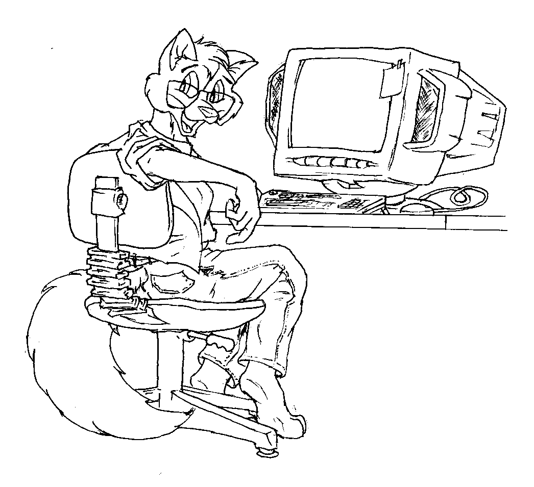 Chris Foxx at his cubicle (would that I had that monitor in Real Life!!) Drawn by "Iron Raptor" |